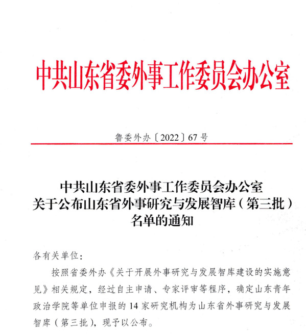 为进一步提高山东省外事研究与发展智库建设水平,来自全省25所高校、科研机构的39家智库发起成立山东省外事研究与发展智库联盟,汇集众智,科学决策,更好服务全省外事工作,为中国特色大国外交和新时代社会主义现代化强省提供更加有力的智力支持。