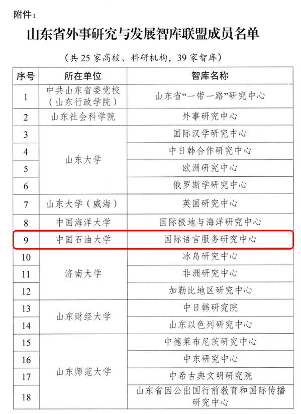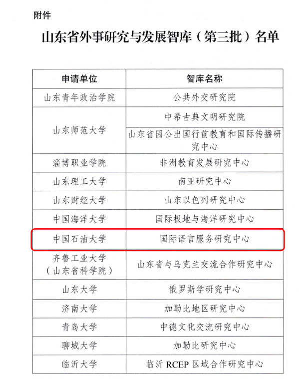近日,《中共山东省委外事工作委员会办公室关于公布山东省外事研究与发展智库(第三批)名单的通知》确定14家研究机构为山东省外事研究与发展智库,公司申报的“国际语言服务研究中心”成功入选,实现公司省级智库平台建设的重大突破,也是公司获批的首个省级智库。