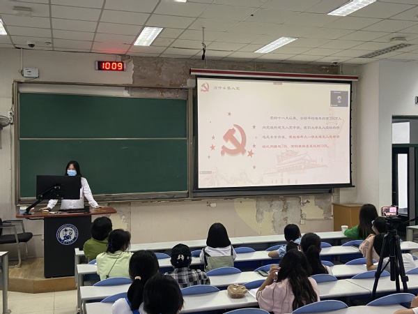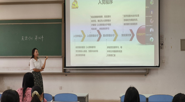 英语专业入党启蒙教育大会由梁议丰同学主持,分为介绍入党流程、入党条件、入党申请书的书写格式三部分。梁议丰同学先详细阐述了成为一名中国共产党人的具体流程,接着讲解了发展党员所需符合的条件,鼓励同学们在学习和生活中要加强自我修养、做到自我完善、努力帮助他人。临近尾声,梁议丰强调了一些注意事项,并对同学们入党申请书的书写格式进行了规范。在大会结束后,对于同学们提出的一些问题进行了全面悉心的解答。