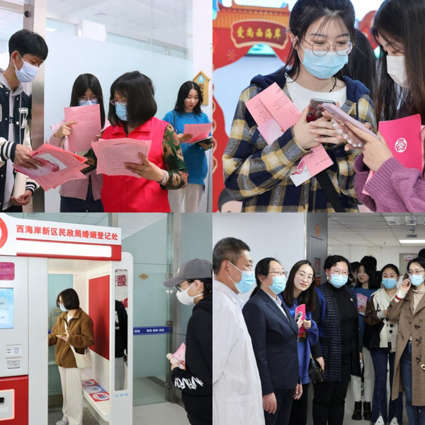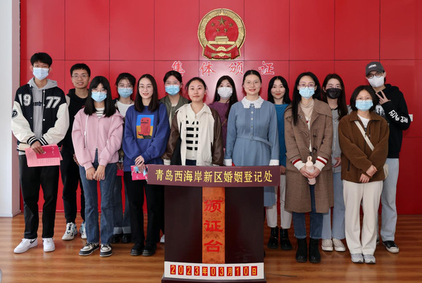 第二站同学们来到了黄岛区民政局,在工作人员的带领下参观了婚姻家庭辅导中心、结婚登记大厅、颁证大厅,了解了黄岛婚俗新面貌。英语2003班员工姚乐表示:“在参观西海岸民政局,沉浸式体验颁证宣誓,了解妇联日常工作的过程中,让我明白了建立一段健康持久的婚姻关系,组建一个和睦美满的家庭,不仅仅需要激情,更需要彼此相互支持、包容和不断磨合,因此我们要树立健康、理性的恋爱观。作为当代女老员工,我们要坚定理想信念、形成正确价值判断,以自尊自信的良好心态面对世界和人生。”