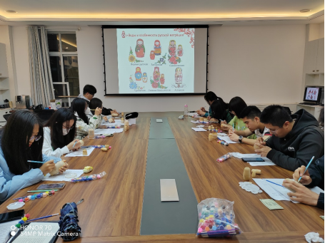 本次俄语角的主题是“走进俄罗斯套娃”。主持人为大家讲解了俄罗斯套娃的起源、艺术形象、种类特点及其象征意义,Юрий老师还为大家补充了一些关于俄罗斯套娃的小知识。对俄罗斯套娃初步了解后,赵小华老师带领大家一起在套娃模具上画套娃。大家画的套娃形态各异,憨态可掬,现场笑声阵阵。