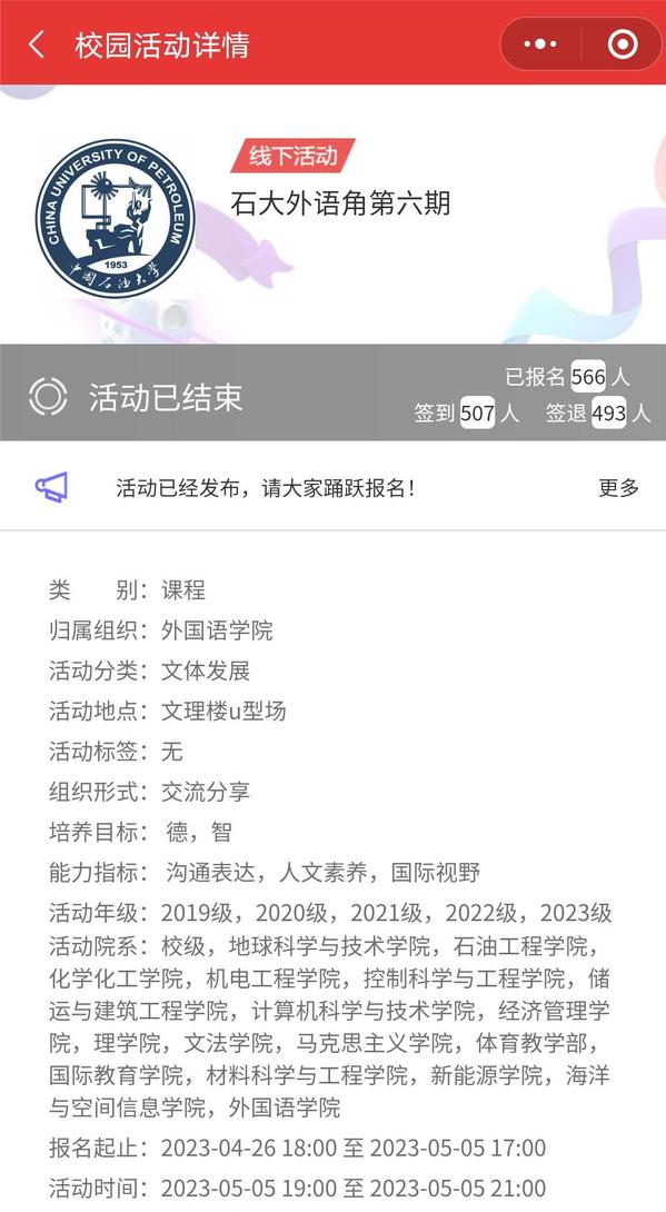 “石大外语角”始终秉持“尚语致用、众行致远”的宗旨,通过搭建师生分享交流的平台,为参与者提供自我展示的机会,营造“讲外语”的浓厚氛围,推进校园外语文化建设,助力培养家国情怀和全球视野。