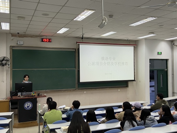 俄语1902班侯家乐现已获得俄罗斯国家研究型高等经济大学当代新闻系全额奖学金,他与大家分享了出国留学的经验。他从择校、择专业等方面详细介绍了中俄政府奖学金和赴俄乌白专业人才培养计划的相关事宜,着重强调了项目的申请时间及申请难度。