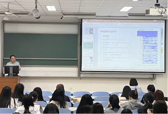 宣讲会开始,刘洋经理以《专利翻译AT(增强型翻译)模式实践与ChatGPT初探》为题,围绕专利翻译行业特点、专利行业的AT探索与实践分享以及专利翻译行业对ChatGPT 3.5与4.0的初步评估等三大方面进行了分析。首先,他向同学们对RWS中国公司进行了基本介绍。RWS是全球最知名的翻译公司之一,也是全球领先的知识产权、翻译和本地化及生命科学语言服务解决方案提供商。该公司基于“增强型翻译模式”理念,形成了独特的专利翻译工具及翻译流程,如翻译记忆库、翻译术语库、机器翻译的应用与评测、RWS内部训练库、自动化工具集、管理仪表盘等,从而提供了业内一流的语言服务。接下来,刘洋经理为在座师生介绍了如今专利翻译行业现状、翻译流程中运用到的工具以及在ChatGPT冲击下专利翻译所呈现出的优势。刘洋经理鼓励同学们积极参与专业相关合作,培养专利翻译能力,通过亲身实践加强对翻译实践环节的认识,促进自身的全面发展。