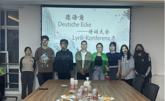 在德语角,主持人介绍了诗歌在中德语言文学中的重要地位,大家一起诵读了德语版本的唐诗名篇《春晓》、《望岳》、《鹿柴》等。孙锦老师带领大家一起学习了德语的“精灵诗(十一字诗)”。打擂环节中,所有到场同学在书签上写下一首属于自己的德语小诗进行分享,最终来自材料专业的潘睿扬同学以一首乘风破浪的“少年”赢得了本期德语角的擂主。现场氛围轻松,大家在参与中了解了更多语言和文化知识,丰富了对德语的认识。