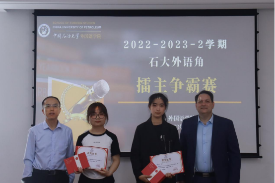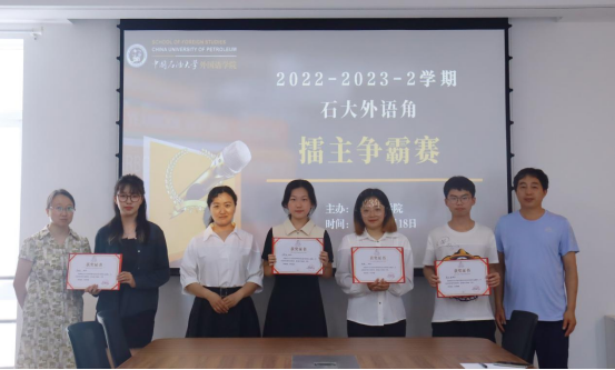 经过2022-2023-2学期的九期外语角的沉淀,2023年6月18日下午在文理楼346,九期外语角的擂主齐聚一堂,石大外语角春季擂主争霸赛顺利举行。公司王新博、刘媛媛、林超老师、杨芳、朱荫成、孔媛媛六位老师以及外教Neville Edwards出席比赛并担任评委,英语口译专业硕士研究生英语口译研究生丁子航和高潇担任主持人。
