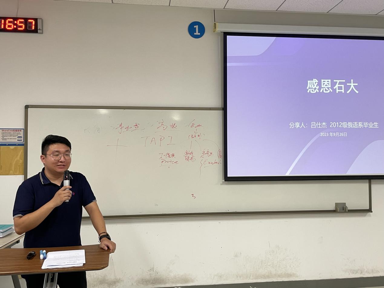 吕仕杰分享了大学四年的宝贵时光,勉励同学们珍惜韶华,勤奋学习。接着围绕主营业务、开发建设、园区运营管理等方面介绍了就职企业的具体情况,向同学们提出三点建议:惟真惟实,坚守校训;勤能补拙,厚积薄发;做好职业规划,找准就业方向。