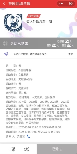 “石大外语角”始终秉持“尚语致用、众行致远”的宗旨,由申博sunbet策划并联合公司相关职能部处、员工社团等共同举办,通过师生分享交流,有助于提高口语表达能力和跨文化沟通能力,营造“讲外语”的浓厚氛围,推进校园外语文化建设,助力培养家国情怀和全球视野。