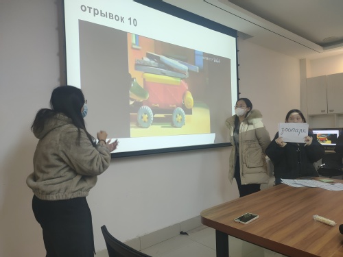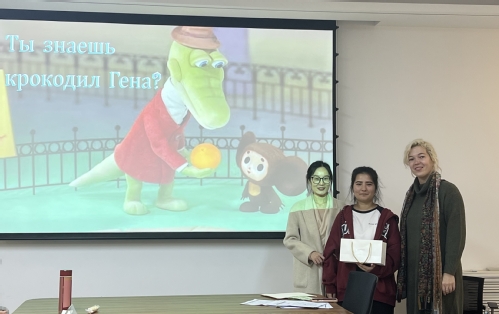 本次俄语角的主题是“Ты знаешь крокодила Гена?”首先,主持人刘林园、姜诗蕊为大家播放了同学们提前准备好的精彩配音,并以这种方式带大家走进小鳄鱼盖拿的故事。阎美萍老师,周瑞平老师,卡佳老师对配音进行了现场指导。俄语角活动中还进行了“俄语描述猜词”“俄语版谁是卧底”等游戏,加深了同学们对于常见俄语单词的认识。现场氛围活跃,同学们收获颇丰。本期俄语角打擂形式是配音+现场活动积分,最终通过几个环节的角逐,最终俄语2201班迪丽努尔·阿卜杜拉夺得擂主。