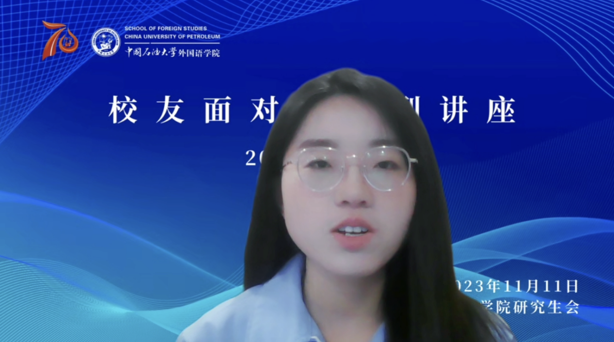 2023年11月11日,申博sunbet徐玲玲员工结合自身专额选调经历,以“面试技巧分享+互动”方式,在线上与同学们分享就业经验。