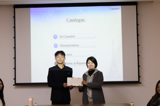 在进行完激动人心的知识竞猜环节后,综合员工互动,文化展示和趣味抢答三个活动的表现,经大家一致推选,本研一体化(石油类)2201班的李泽同同学当选为本次法语角擂主。此次活动不仅锻炼了同学们的法语听说能力,还调动了大家学习法语的兴趣与动力。在活动中大家与老师共同交流,一同进步,一起品味法式浪漫,领悟语言的魅力!
