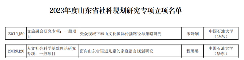 日前,山东省哲学社会科学工作办公室公布了2023年度省社科规划研究专项立项名单。2023年度山东省社科规划13个研究专项经过通讯初评、会议评审,共评选出立项项目462项。其中,公司宋姝娴博士的《受众视域下泰山文化国际传播路径与策略研究》获批文旅融合研究专项一般项目,程璐璐教授的《面向山东省语迟儿童的家庭语言规划研究》获批人文社会科学基础理论研究一般项目。此次立项对于促进公司团队建设,增强学科影响力具有重要意义。