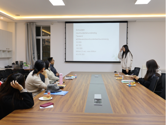本次德语角活动以数字为主题,由主持人进行关于数字手势、时间的正式与非正式表达的讲解与互动,并与老师一起探讨不同国家的一些特殊手势的含义及外国货币样式含义的分享。语言是一面反映各族人民文化的镜子,而语言中的熟语则更能反映各民族丰富的文化传统。此次活动还提及了如“dazu gehören zwei不能一厢情愿(要两个人同意才行)”这样的熟语以让大家对相关表达有更多的了解。活动吸引了一些对于德语非常感兴趣的师生参与,现场气氛热烈。大家获得了一份生动有趣的学习体验。
