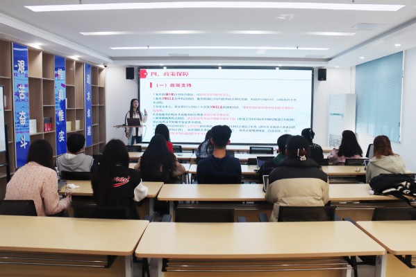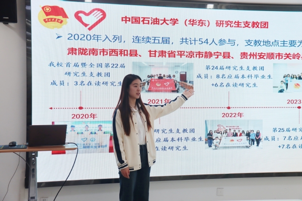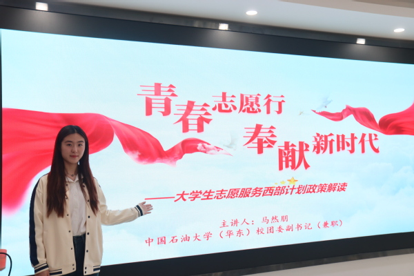 在研支团宣讲环节,马然朋先向大家介绍了研支团项目的发展历程、支教地点和往届优秀志愿者,帮助大家对该项目形成大致认识;接着指出该项目在国家层面、公司层面以及个人层面所具备的重要价值;最后她详细讲述了招募选拔的要求及后续工作,鼓励同学们积极参与,正所谓“用一年不长的时间,做一件终生难忘的事”。