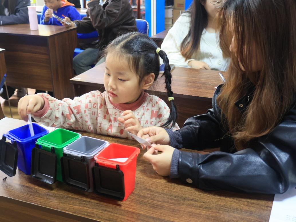 垃圾分类齐学习,共筑绿色环保梦。研究生会志愿者帮助小朋友们区分并记忆可回收垃圾、厨余垃圾、有害垃圾和其他垃圾等相关知识并进行卡片识记,同小朋友们一起进行垃圾分类比赛。他们跃跃欲试,尽管一开始有些手忙脚乱,但逐渐掌握了技巧,分类也越来越得心应手。比赛进行十分顺利,研究生会贴心地为小朋友们提前准备了知识比赛奖品,最终角逐出一等奖1名、二等奖3名、三等奖3名。