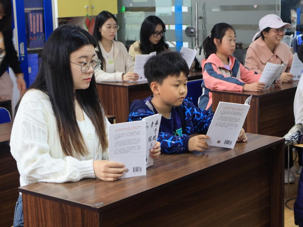 文明规范,素质青年。研究生会成员帮助小朋友们诵读《弟子规》,大家围坐一起,小朋友们有的朗读有的背诵,表现极佳,现场掌声阵阵。