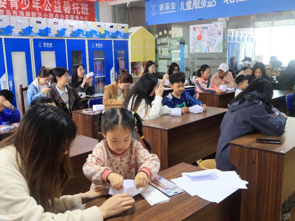 节约资源,变废为宝。于潇洋带领大家使用A4纸折垃圾盒,小朋友们热情高涨,在志愿者的帮助下共同完成折叠活动,通过这一环节,大家不仅掌握了如何折叠垃圾盒,而且学会了如何变废纸为宝,保证垃圾不乱丢。