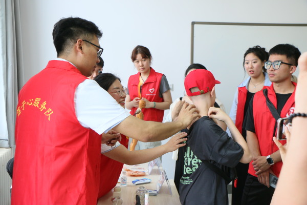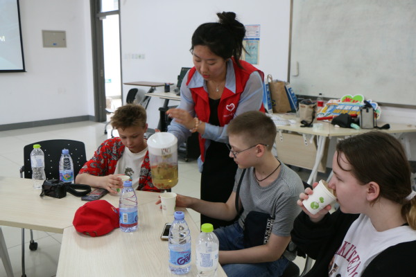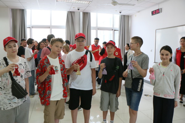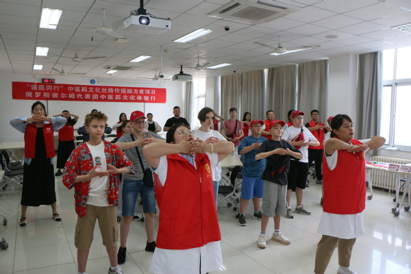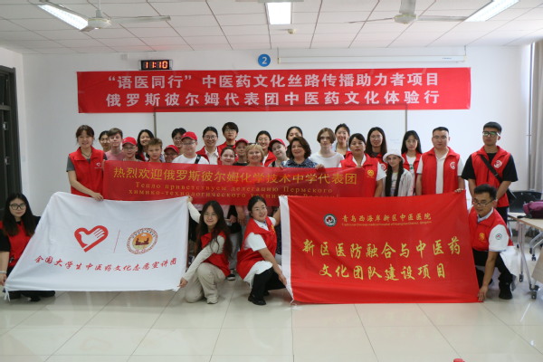 随后,公司语医同行志愿服务队携手西海岸中医医院莲子心志愿服务队,精心策划了一场中医药文化体验活动。代表团成员在志愿者的带领下,一同练习了中国传统养生功法——八段锦,感受其调和气血、强身健体的独特魅力。不仅如此,他们还亲手制作了蕴含中药精华的香囊,品味了中医养生茶饮——菊花枸杞茶,体验了按摩、针灸、拔罐、穴位贴敷及三伏贴等传统中医疗法。这些亲身体验不仅让代表团成员们对中国博大精深的中医文化赞叹不已,也加深了他们对中华传统文化的理解与兴趣。志愿者张玉表示,“我们一起体验了多样的中医文化活动,不仅加强了与俄罗斯中员工的交流,也加深了彼此的友谊。在传递中医药智慧的同时,我们自己也受益匪浅,提升了自己的中医文化素养。”
