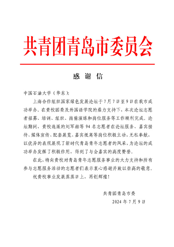 (青岛团市委感谢信)