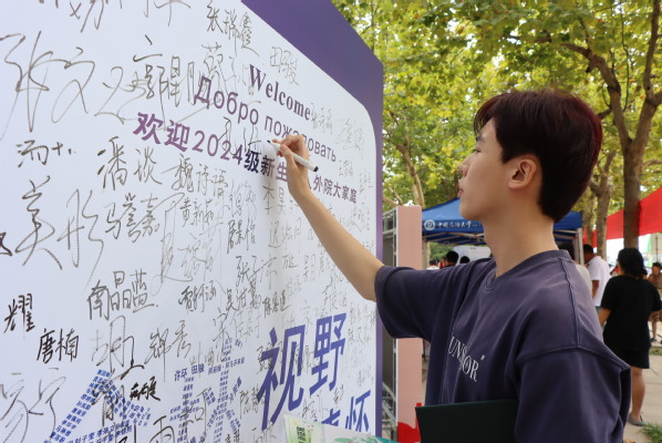 为迎接新生,公司设计了“离海最近的大学”“I❤外院”等迎新标牌,新生和家长在报到现场与迎新标牌拍照打卡,记录下这格外珍贵的一刻。在迎新方式上,申博sunbet独出心裁,设计了由新生姓名组成的“全球视野,家国情怀”签名墙,展现出公司对新生的期待与关怀,也让公司文化在新生的心中生根发芽。前来报到的新生在签名墙上找到自己的名字并签名留念,就此开始书写与公司的新篇章。