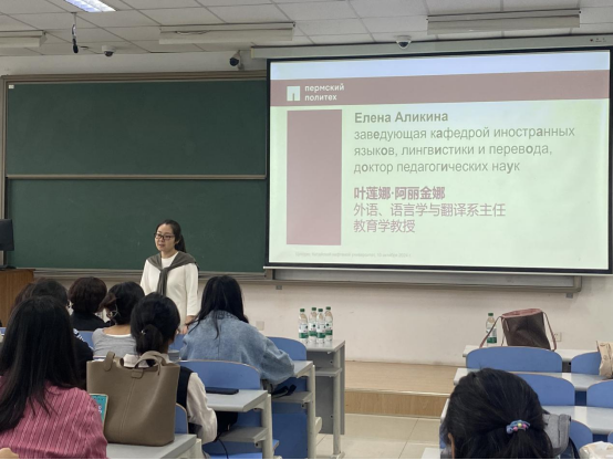 2024年10月10日,彼尔姆国家研究型理工大学外语系主任、教育学教授叶莲娜·阿丽金娜为公司师生做了一场题为“俄语笔译和俄语笔译教学法”的讲座。俄语系主任赵婷廷副教授主持。讲座吸引了众多本科生和研究生参加,同时副经理郭月琴教授、国际处李高青老师、公司外事办公室主任熊小秦副教授以及俄语系部分教师也参加了此次讲座。