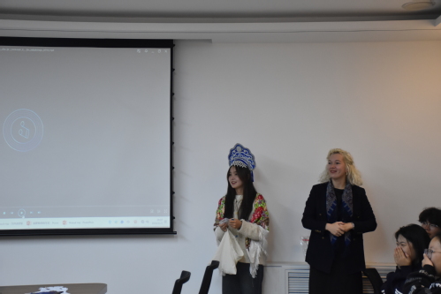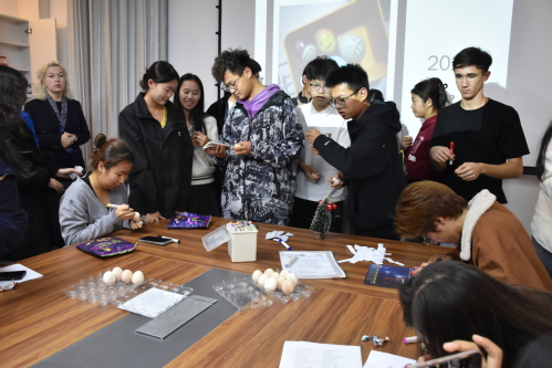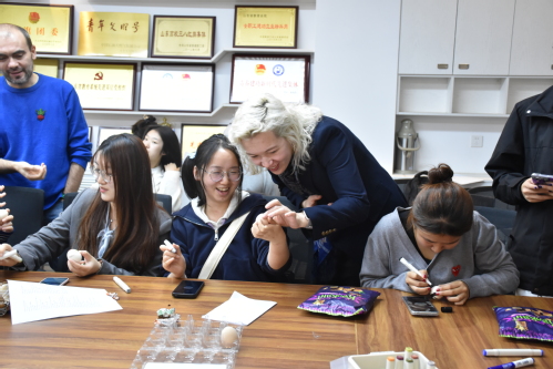 俄语角主题为“俄罗斯传统节日”,两位主持人共讲述了俄罗斯四个传统节日的由来与寓意,来自俄罗斯职工与本地同学踊跃参加。之后由卡佳老师讲述关于俄罗斯圣诞节的相关故事,两位同学扮演的严冬老人与雪姑娘也让在场同学眼前一亮,完美展现了俄罗斯独特的圣诞节;尤里老师讲述了俄罗斯宗教文化节日复活节,并带领同学们一起在熟鸡蛋上画出自己喜欢的图案,天马行空的想法游动在鸡蛋上,赋予鸡蛋别样的生命力。其中接受率最高的是来自外国员工尼克的“三旗”—中国、土库曼斯坦、俄罗斯三国国旗,这不仅展现出一带一路各国极强的凝聚力,也诠释着三国人民对于一带一路的热烈支持。通过交流使得到场同学加深了对于俄罗斯传统文化的理解,也促进了到场职工同学的汉语水平的进步。最终刘阔华同学成为本期擂主。
