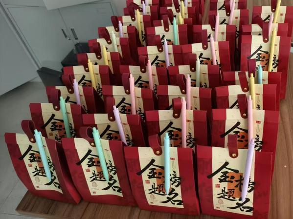 沉甸甸的考研暖心礼包,每一份礼物都经过精心挑选,蕴含着对考研学子深深的期许:火红的“金榜题名”礼袋传递着祝福与期盼;一条士力架助力外院考研学子保持最佳状态,勇往直前;精致的“逢考必过”手串,编织着满满的祈愿,带来好运与自信;晨光孔庙祈福涂卡笔与定制0.5mm中性笔,共同见证着努力的汗水与成长的喜悦;一罐旺仔牛奶补充元气,寓意身体强健、好运连连;随机赠送的金属文字书签,不同的创意,一样的祝福。每一份礼物都是对他们努力与成长的温馨见证与美好祈愿。