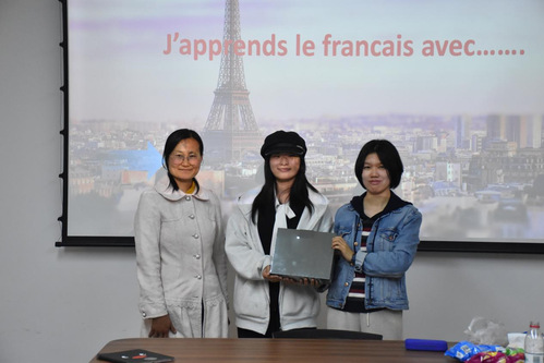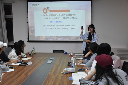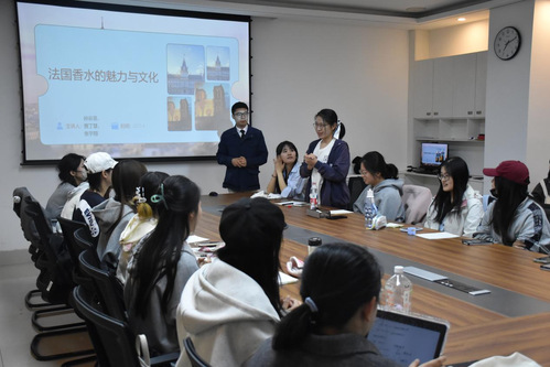 法语角在文理楼 346 室同期举办,以《法国香水的魅力与文化》为主题。主持人孙云菲、张宇翔、贾丁慧带领近 40 名师生开启 “芳香之旅”,法语教师李小华、冯鸿燕到场指导。活动涵盖法语自我介绍、香水起源视频观赏、格拉斯香水历史讲解、经典品牌(如香奈儿、迪奥等)文化解析、中法香氛文化对比等环节,并通过法语数字抢答、“逢三过”、名字接龙等趣味游戏增强互动性。张茗竹同学在游戏环节表现突出,摘得 “擂主” 称号。