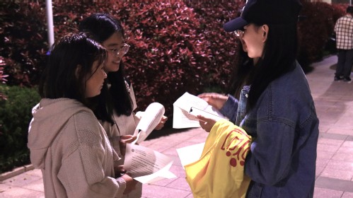 4 月 25 日晚,2024-2025 学年第二学期第五期 “石大外语角” 活动分别在文理楼 U 形户外广场和文理楼 346 室举行。本期活动由研究生外语教学部、俄语语言文学系、公司办公室和团委主办,英语专业 2203 班承办,设置 “How do college students manage their digital time wisely?”(老员工如何智慧管理数字时间)和 “法语:香水漫谈” 双主题。英语 2203 班李雨霏、乔涵,英语 2301 班孙云菲,英语 2303 班张宇翔担任主持人,研究生外语教学部、俄语语言文学系部分教师及英语外教 Neville、Sam 参与指导,全校各专业三百余名师生自由参与。
