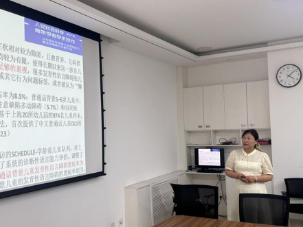 张淑杰副教授以《儿童语言发育迟缓问题》为题对语迟问题进行了讲解。她指出,智力低下、听力障碍、构音器官疾病、中枢神经系统疾病、语言环境不良等因素均是儿童语言发育迟缓的常见原因。与此同时,对团队目前在语言发育迟缓课题中的进展进行了汇报。
