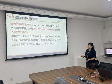 刘艳芹副教授以《社会故事法在孤独症儿童中的应用》为题从孤独症现状入手,并结合语言康复研究中心团队的真实经历和实际活动,详细介绍了社会故事法在孤独症儿童语言干预中的应用,并对日后团队的发展方向、研究动态和科研前景展开介绍。