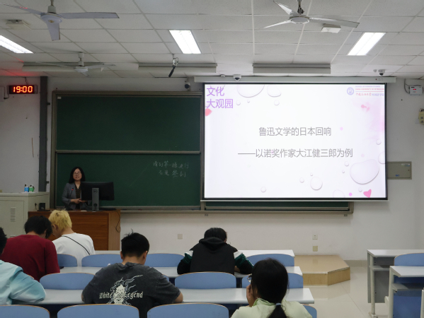 邵艳平副教授以图文并茂的形式回顾了鲁迅先生的生平,讲述了鲁迅先生在日本留学期间的生活、与藤野严九郎先生等日本友人的交往。她重点介绍了日本著名的反战作家大江健三郎,深度阐释了鲁迅文学之于大江健三郎文学素养的熏陶。邵艳平副教授不仅展现了大江健三郎在文学创作过程中坚韧不拔的品质,也展示了他和莫言在山东高密所建立的深厚友情,特别是他对莫言必将在十年内获得诺贝尔文学奖的预言。这个预言根植于大江健三郎对中国文学深厚内涵的自信,也展现了中日两国民间友谊的珍贵。邵艳平副教授引用莫言对大江健三郎的评价作为讲座的结束——“他(大江健三郎)的文学是大于文学的”。