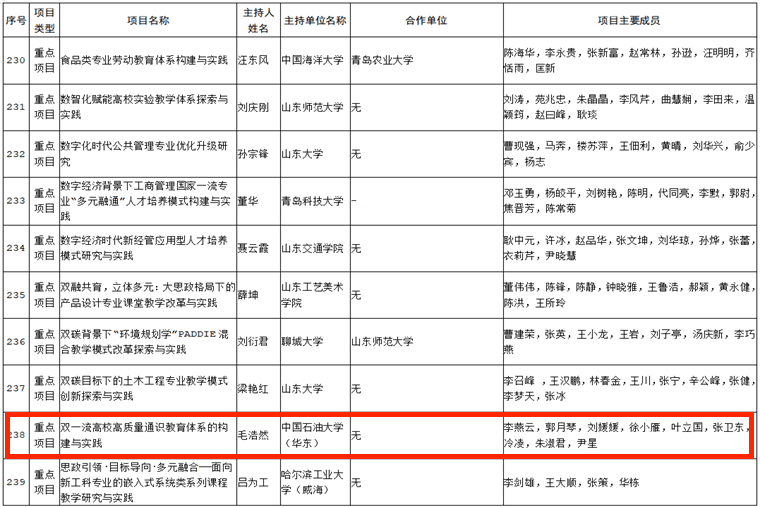 3. 毛浩然,2022,双一流高校高质量通识教育体系的构建与实践,山东省本科高校教学改革研究重点项目