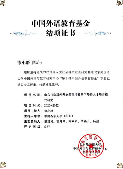 2. 徐小雁,2020,山东打造对外开放新高地背景下外语人才培养模式研究,第十批“中国外语教育基金”项目
