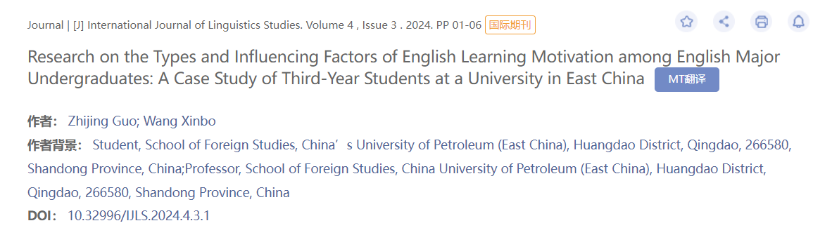 27.郭芷敬,Research on the Types and Influencing Factors ofEnglish Learning Motivation Among English Major Undergraduates: A Case Studyof Third-Year Students at a University in East China
