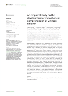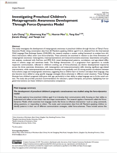5. Investigating Preschool Children’s Metapragmatic Awareness Development through Force-Dynamics Model[J]. SAGE Open,2025[SSCI一区] | 6. An Empirical Study on the Development of Metaphorical Comprehension of Chinese Children[J]. Frontiers in Psychology ,2024,14[SSCI一区] |