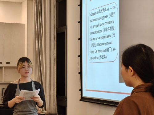 文理楼346的俄语角活动也精彩纷呈。主持人许环、李锦熙带领同学们开启了一场沉浸式的俄语电影艺术与音乐鉴赏文化之旅。活动通过经典影片片段赏析、主题音乐品鉴、文化背景解读等形式,带领同学们深入领略《危楼愚夫》《我是龙》等作品的艺术魅力。在沉浸式体验中,同学们专注聆听、细致记录,围绕影片主题与音乐特色展开热烈研讨,不仅进一步激发了俄语学习热情,更对俄罗斯文化形成了多维度、立体化的认知,同时深刻体会到俄语语言的音韵美感与语法精妙。俄语专业教师全程参与互动,针对同学们的语言表达精度、文化理解深度等方面进行细致指导。