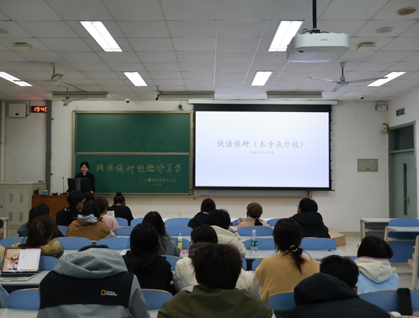 分享会上,成功保研本校英语笔译方向的马晓雯学姐结合自身保研经历,从“学科特色”出发拆解重点,分析英语专业读研前景,为英语专业员工提供针对性指导。推免至中国政法大学法律(非法学)专业涉外律的吴琦学姐围绕“选择保研目标院校时,应该如何权衡‘院校排名、专业实力、地域资源’这几个因素”展开,详细讲解文献阅读、学术论文撰写的实用方法。刘奕琳学姐凭借优异成绩和多项专业竞赛奖项上岸北京外国语大学英语笔译专业,强调专业竞赛成绩与专业核心课绩点的平衡技巧。李雨霏学姐作为研支团成员,侧重分享兼顾学业成绩与志愿服务的高效路径,现推免至本校外国语言文学方向。俄语专业保研分享主要分为本专业保外校及跨专业保研,方贤珠学姐和刘林园学姐分别推免至厦门大学及兰州大学俄语笔译专业,她们提到“平衡保研准备和日常课程,以及高压环境下学会调整心态”是非常重要的,同时分享俄语专业四级备考策略、俄汉互译能力强化路径,提升个人竞争力的方法,王怡辰学姐和王颢頔学姐大学期间均担任班级和院部员工干部,现场展示个人保研简历、复试准备笔记,让保研干货内容更直观可学,分别推免至山东大学马克思主义理论专业和陕西师范大学马克思主义公司。