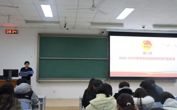 此次开班典礼共分为四项议程。首先,全体学员合唱中国共青团团歌《光荣啊,中国共青团》。接下来,2024-2025学年培训班优秀学员代表孙慧伦发言。她以自身成长经历为切入点,阐释了团校培训对个人思想提升与能力成长的重要意义,生动讲述了从一名普通团支书到团总支副书记的蜕变历程。“在正确的人生道路上稳步前行,积蓄力量,终有一天能在属于自己的舞台上绽放光芒。”孙慧伦的分享为新学员们提供了宝贵的学习参考。