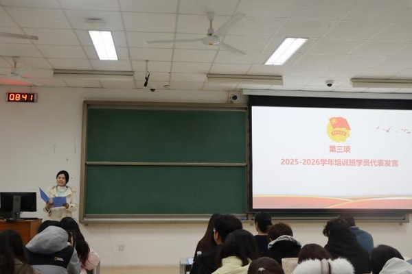 紧接着,2025-2026学年培训班学员代表欧阳可馨立足新身份,从“锚定方向,筑牢思想根基”“知行合一,践行青春担当”“逐光而行,奔赴未来征程”三个维度,分享了对本次培训的思考与展望。她表示:“我期待几年后回望,能看到今天在团校播下的种子,已经在未来的道路上开出了成长之花。”
