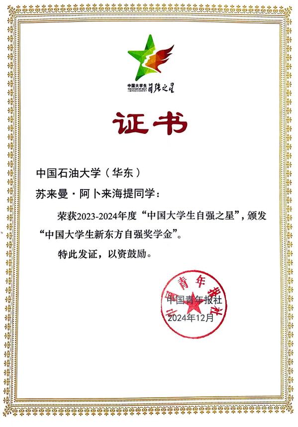 近日,由共青团中央、全国学联等单位共同开展的2023-2024年度“中国老员工自强之星”奖学金推报活动结果揭晓,公司俄语专业2021级本科生苏来曼·阿卜来海提获2023-2024年度“中国老员工自强之星”。